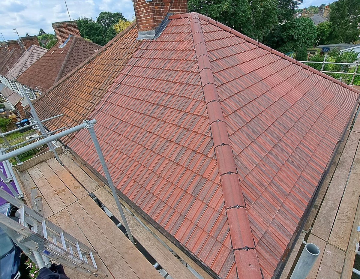 Say goodbye to crumbling mortar. On this job, we used our Dry Ridge Kits rather than traditional mortar. Quick to install, they are designed to let your roof breathe while staying secure in all weathers. Our Dry Ridge Kits are a great choice for homeowners, helping to prevent damp and condensation. The interlocking tiles we installed on this job also create a nice finish.