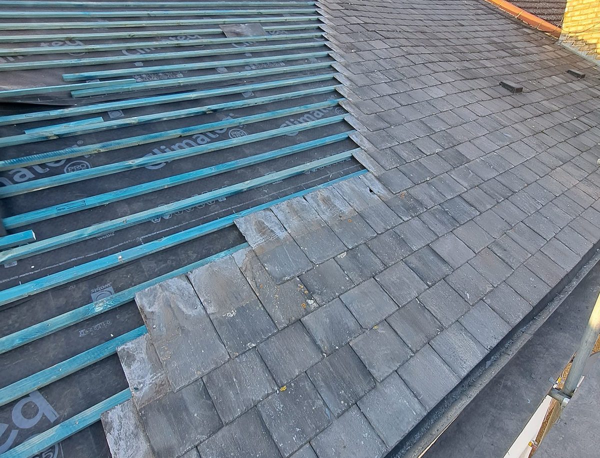Where possible, we will always try and propose cost effective options, as with this example in Hertford. We firstly stripped off the old roof carefully, felt and battened using Breathable Felt and then replaced the existing slates. Saving money on materials & labour, we were able to help this customer with a huge cost saving.